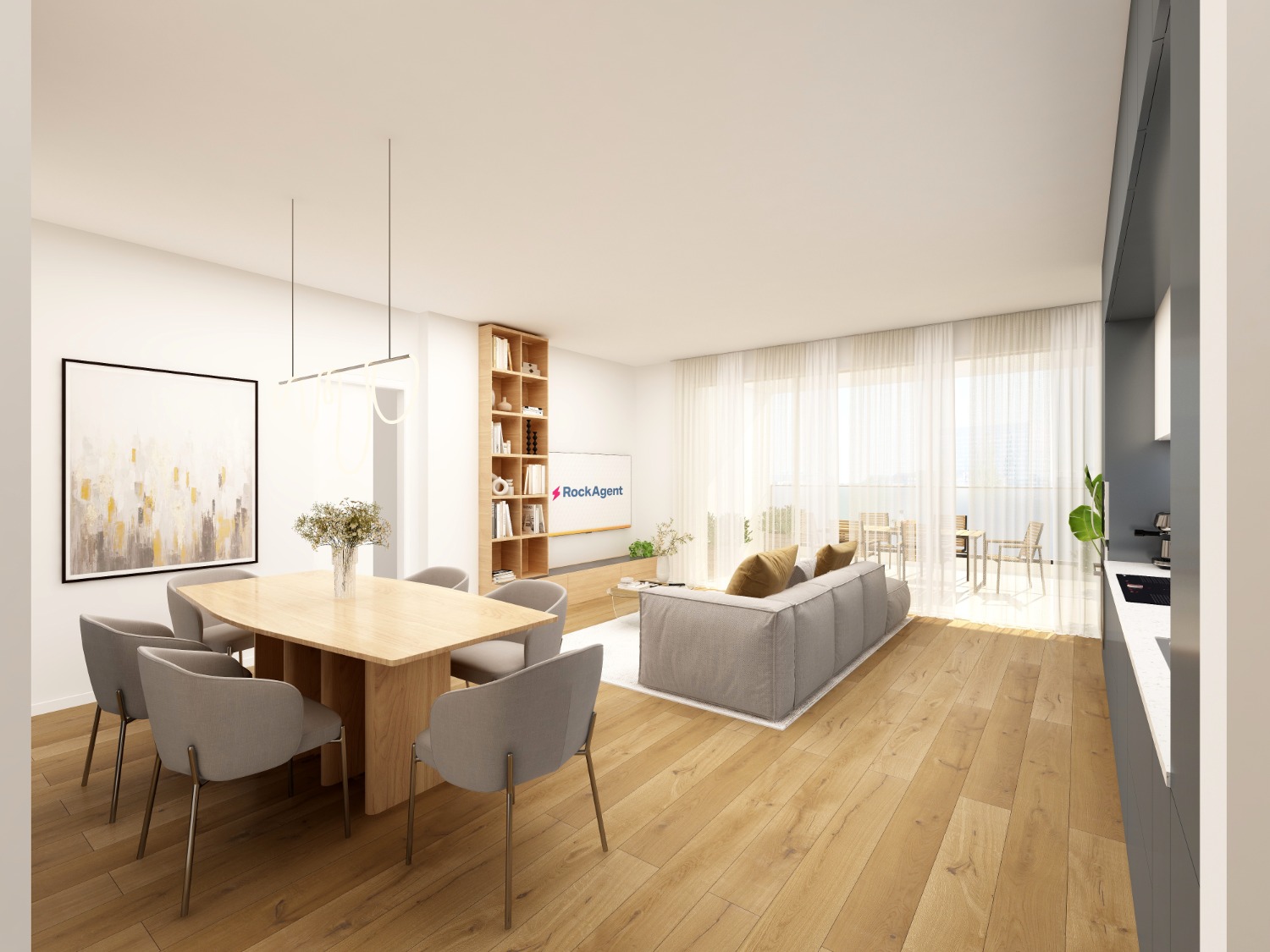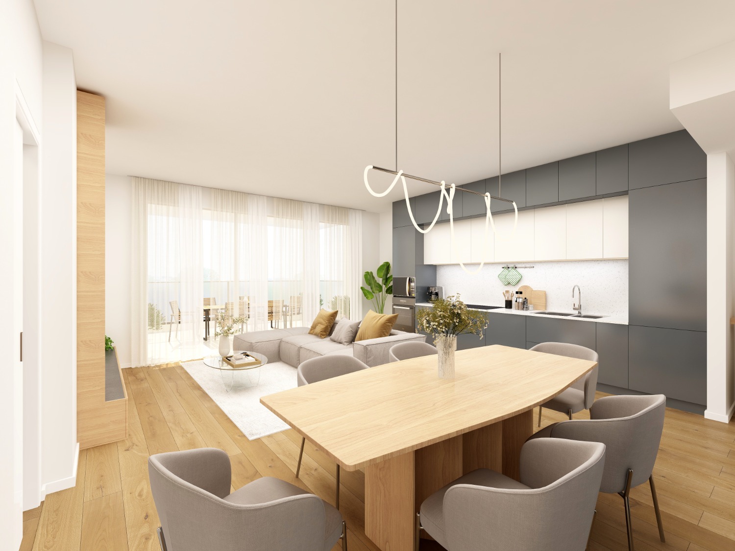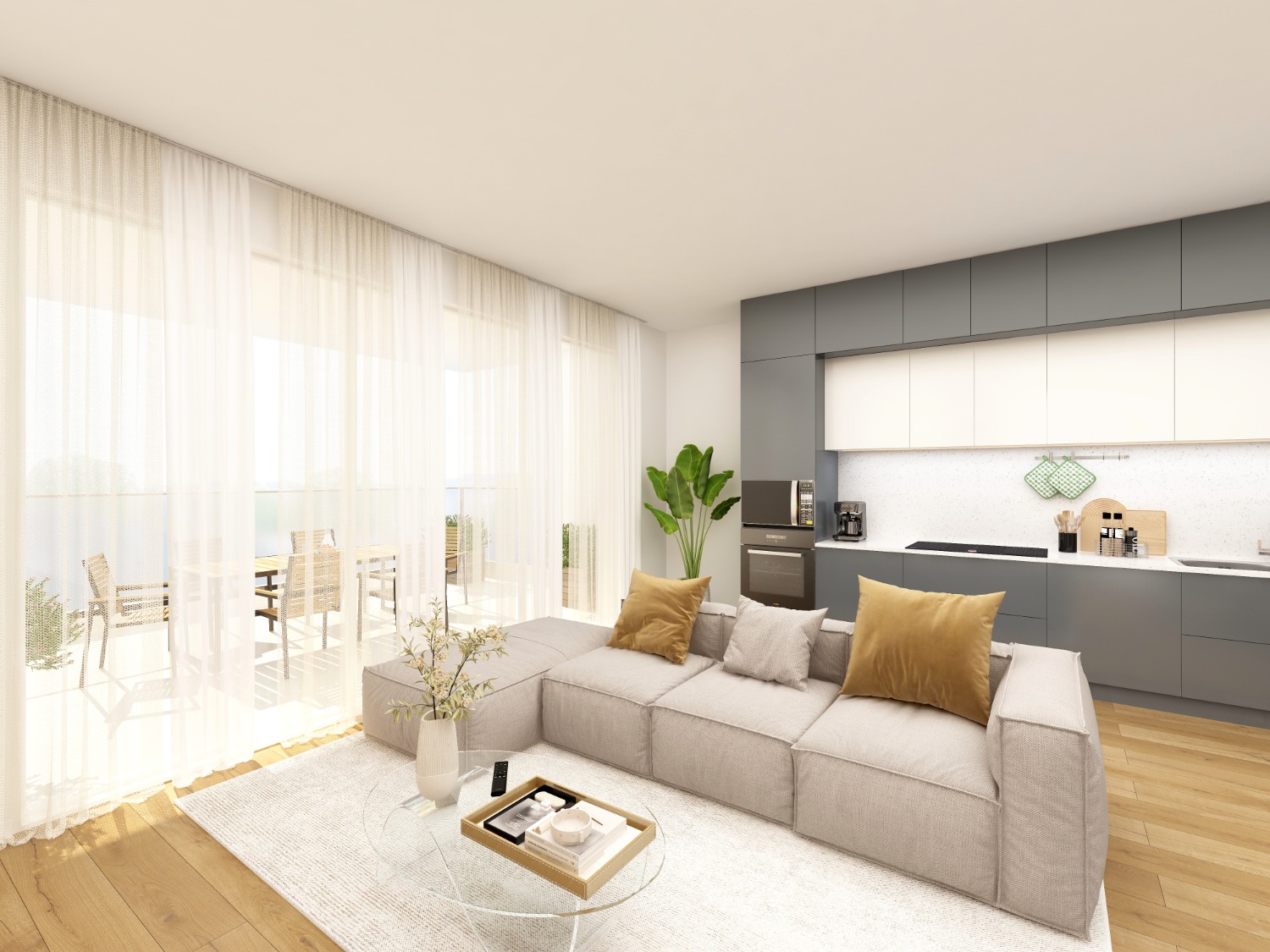 Entri nel living con cucina a vista. Apri la vetrata e sei fuori, sul terrazzo grande e luminoso.