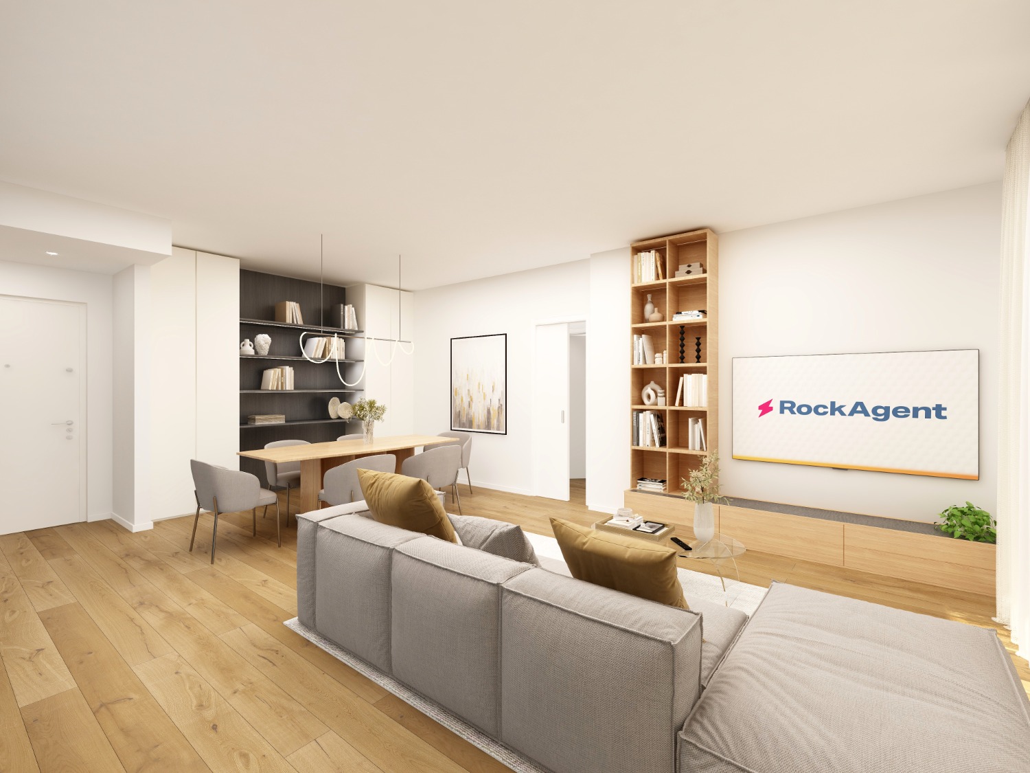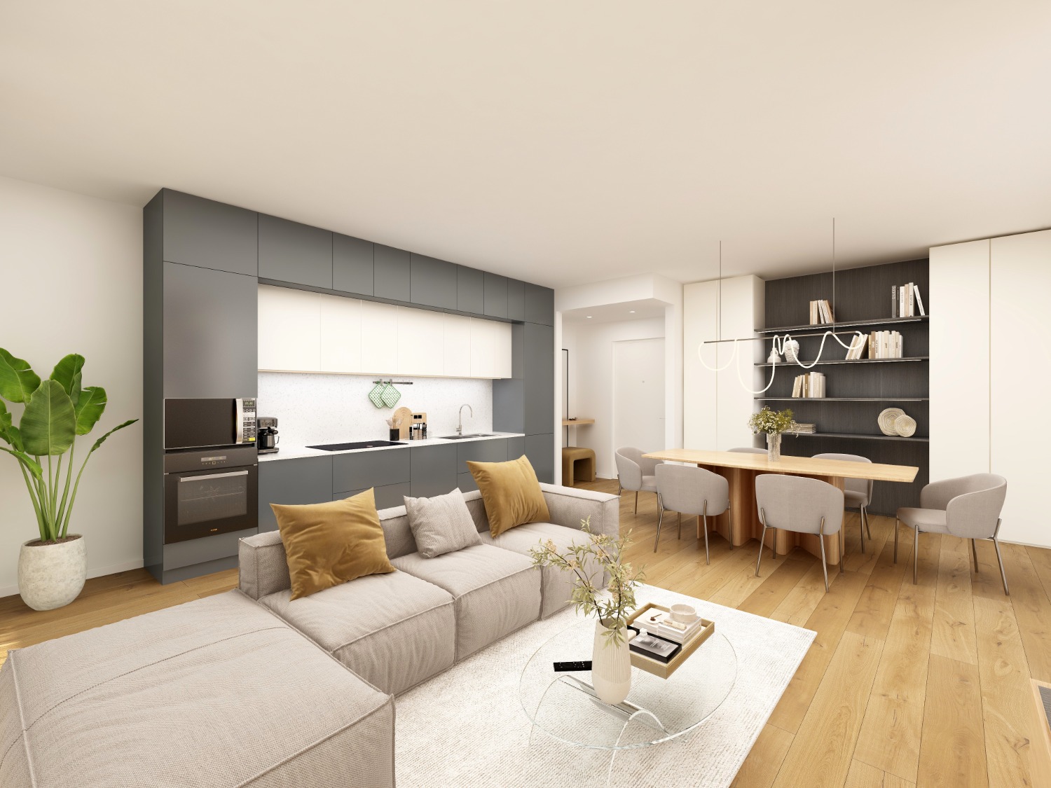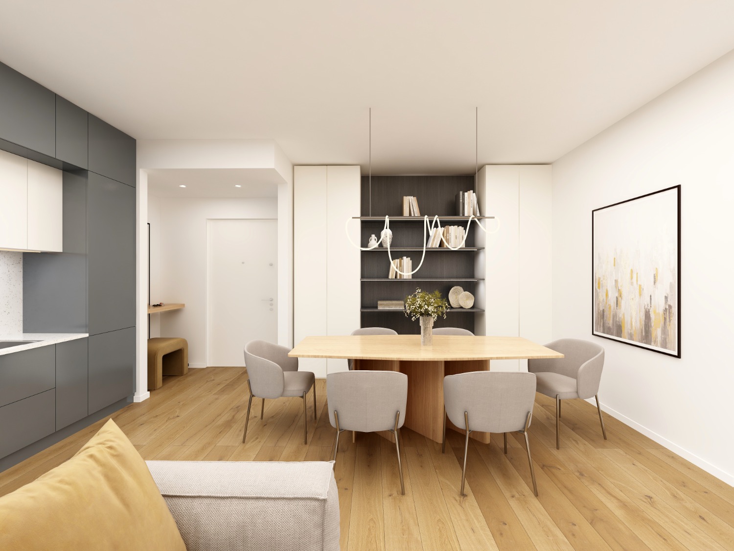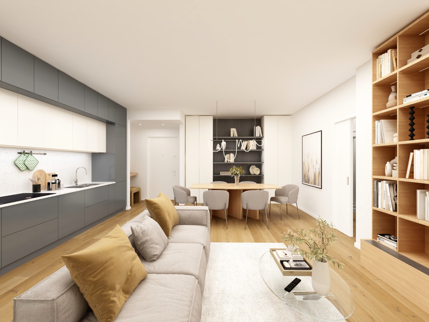 Entri nel living con cucina a vista. Apri la vetrata e sei fuori, sul terrazzo grande e luminoso.