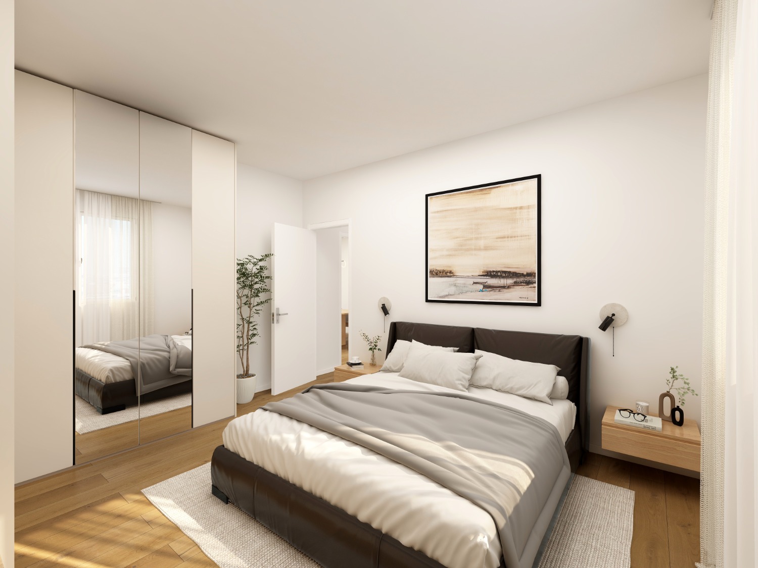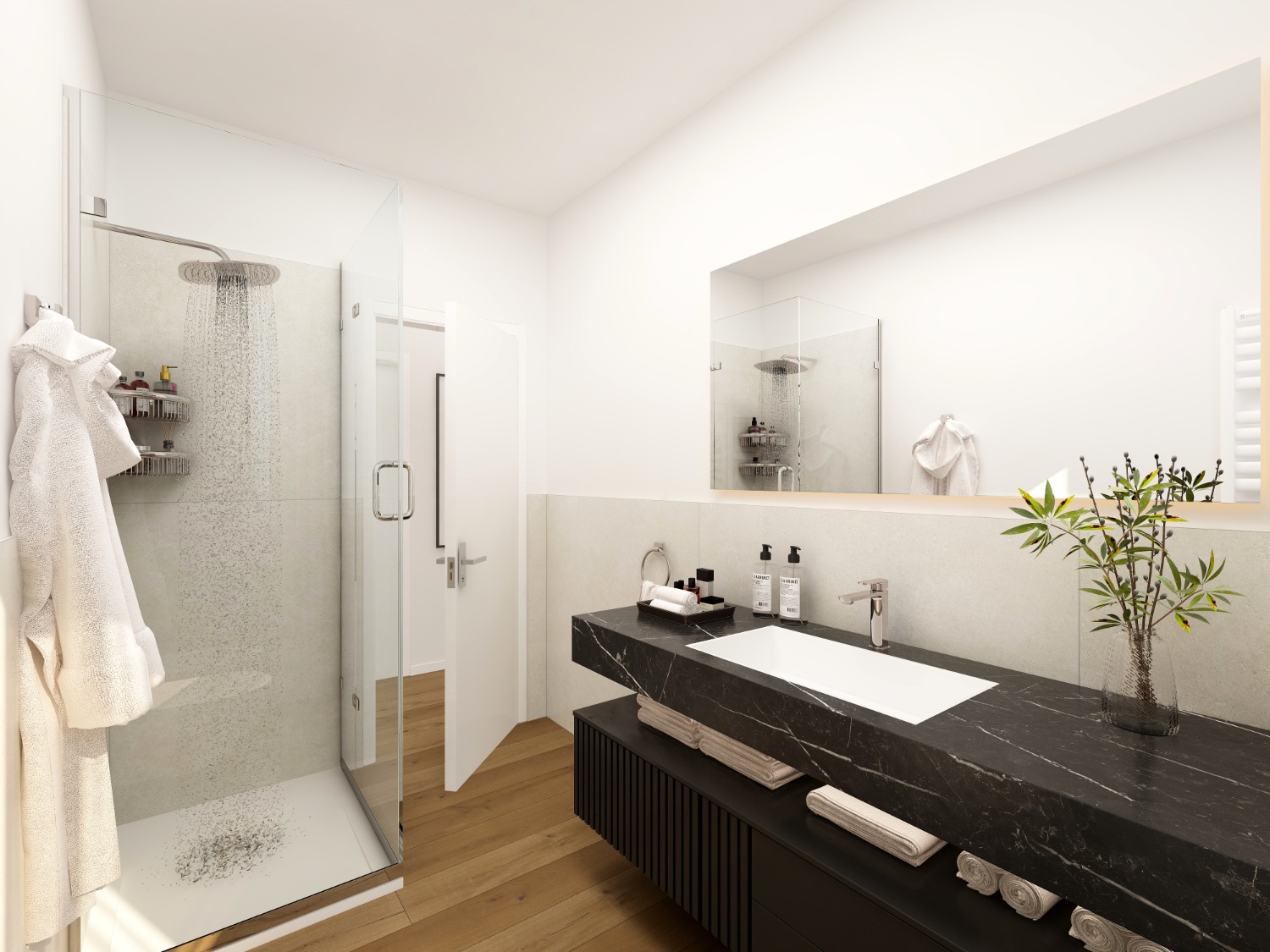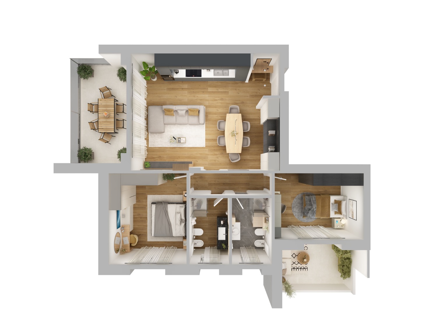 Le due camere nella zona notte sono separate dai due bagni.